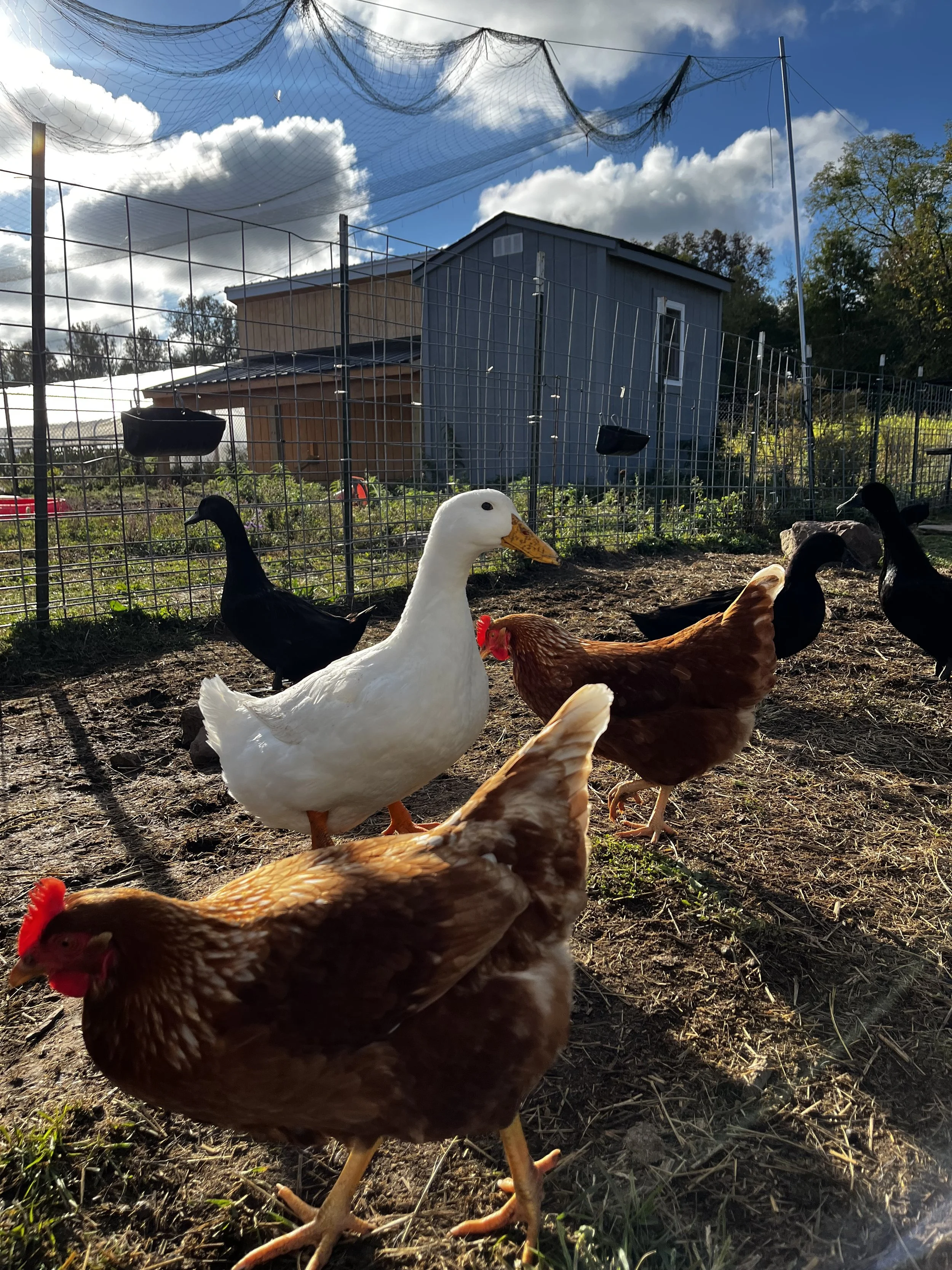 Right now, our farm is home to a growing flock of laying hens and ducks. Each day begins with feeding, fresh water, egg collection, and general care. It’s steady, behind-the-scenes work that keeps the farm running smoothly.